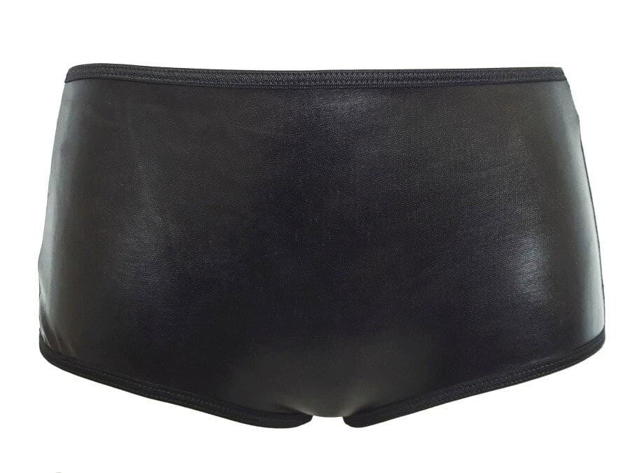 Gorgeous black, metallic glossy underpants. The back is gorgeously bare-bottomed, the front is opaque black. The strips under the buttocks join the front, leaving the crotch open. Sexy ruffles and a bow over the buttocks. Really soft and stretchy pants are comfortable to wear.